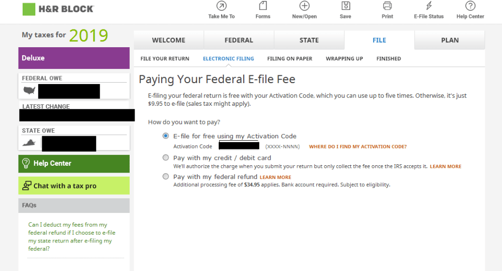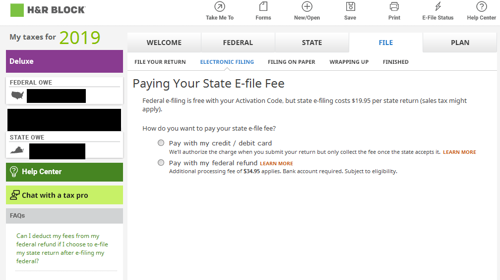 Imagine doing that for several family members, and all of a sudden you’re at eighty bucks so that H&R can SUBMIT the return. And in case the family is too large, or you foolishly purchased a less fancy package, expect to pay $9.95 per federal return to e-file: